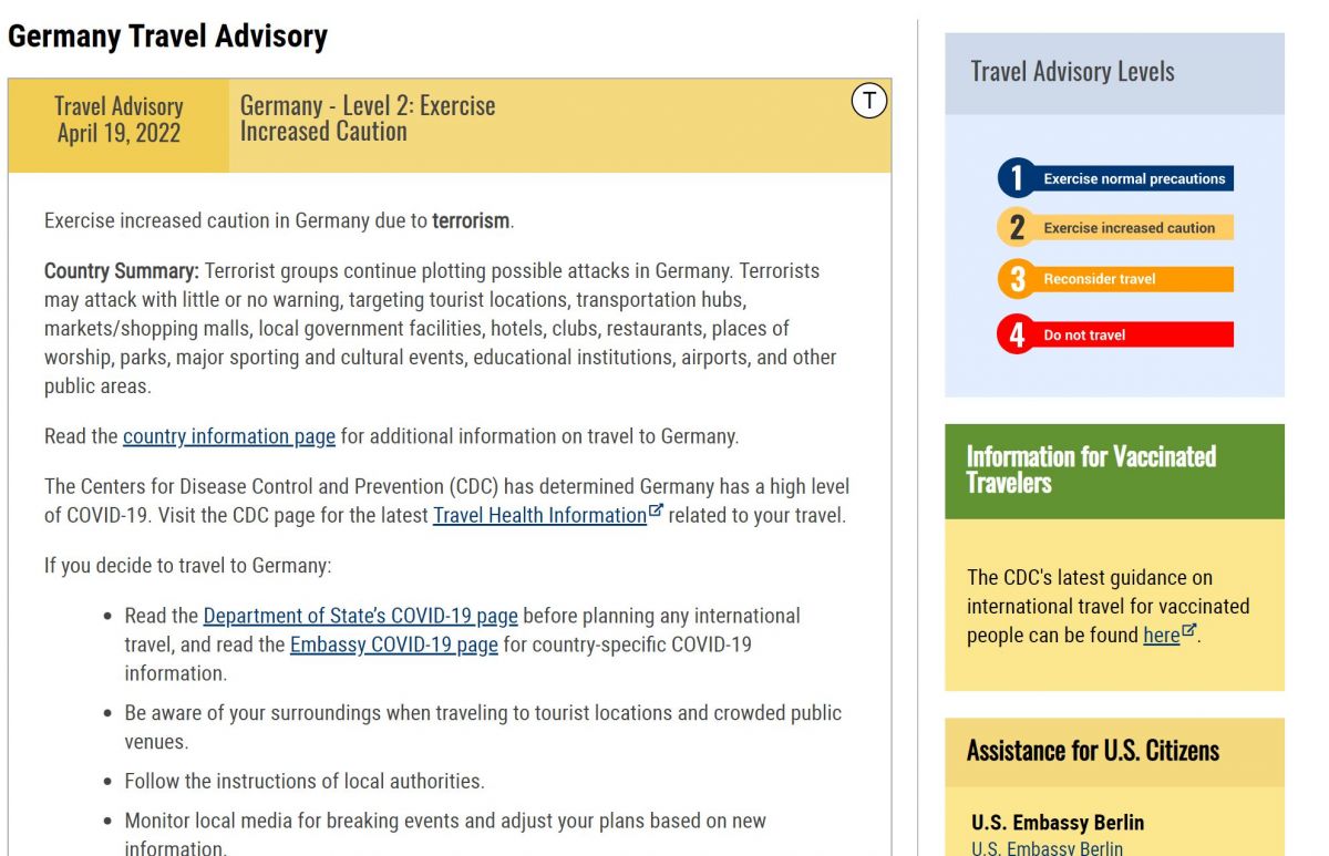 The US Government is advising people to exercise increased caution for a country that is 10x safer than their own? I’m more worried about getting shot in the US than at any point in Germany that’s for sure.