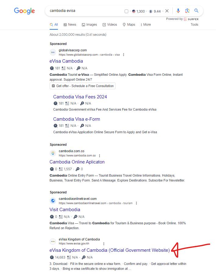 The red arrow is the official Government website of Cambodia and you can always verify this by the URL. Anything that ends in .gov is a legit Government website and what you want to use. For Cambodia, the URL ends in .gov.kh with the KH part being Cambodia. These are official Government websites so no one can create a random website using these URLs.