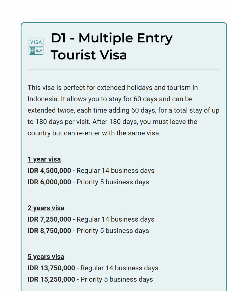 If you plan on staying in Bali for longer than 2 months at a time, the best visa to get is the D1 or C1 visas. The C1 visa is a single entry maximum 6 month visa. It’s not a flat 6 months but instead it grants you 2 months in Indonesia with the option to extend for another 2 months two times for a total of 6 months.