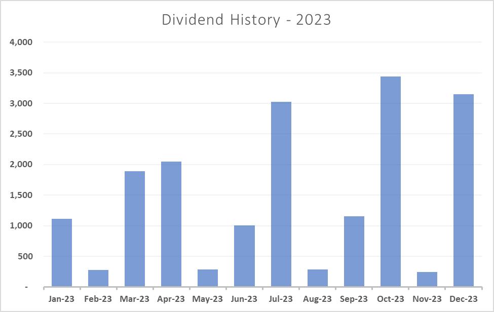 I was hoping for a few market pull backs but this never really materialized so I continued to buy stocks at/near all time highs. I suspect 2024 will continue the market trend of 2023 barring a resurgence of inflation.