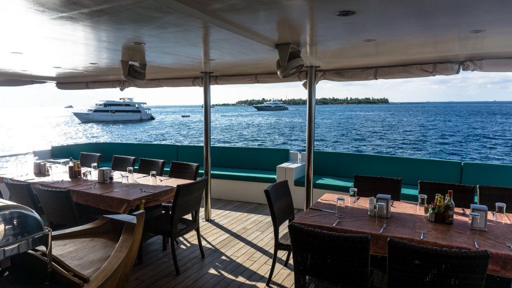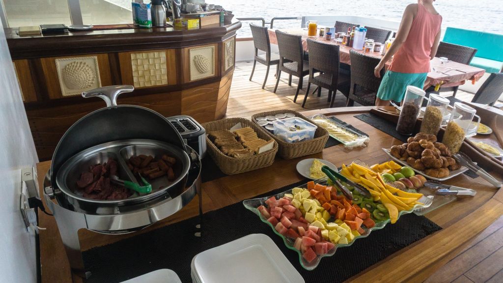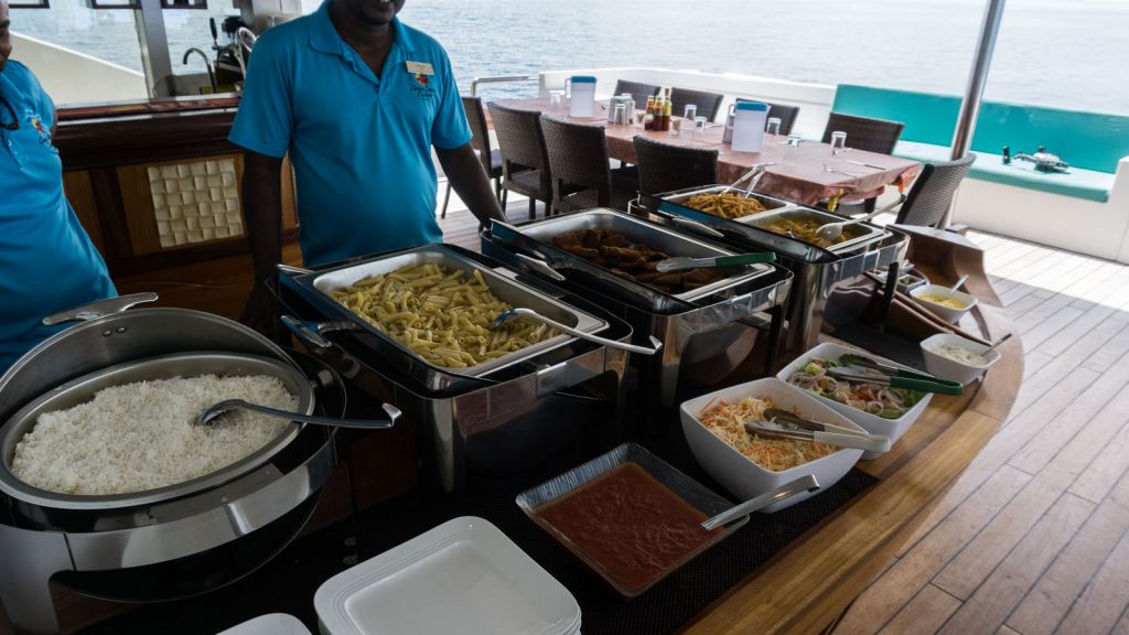 Three meals a day is included in the price of the liveaboard. Alcohol is separate but prices were very good especially compared with what I was paying at the Park Hyatt Hadahaa. Beers were $4 and a bottle of wine was $25 or so.