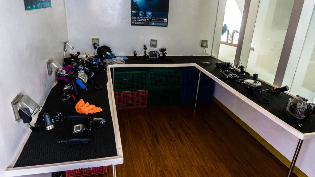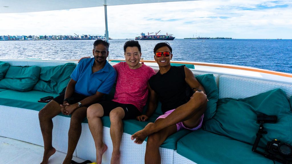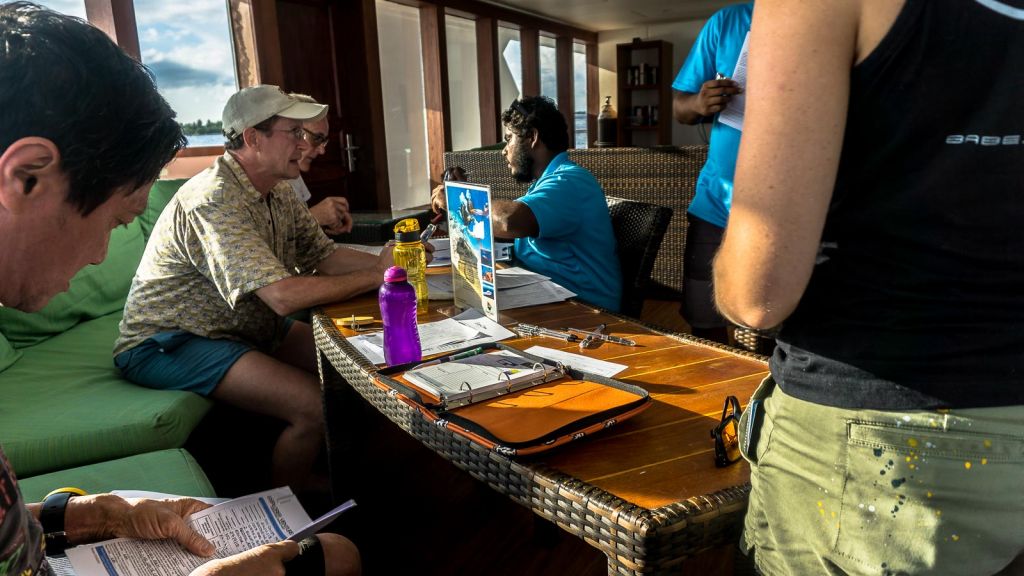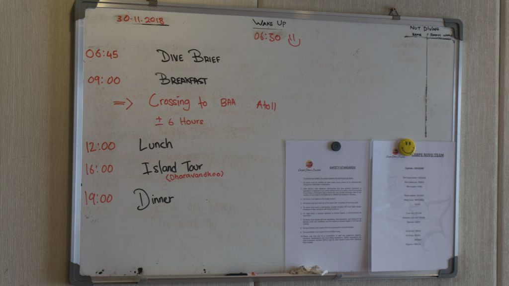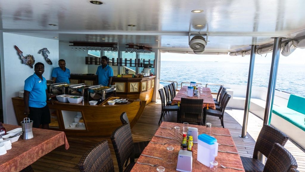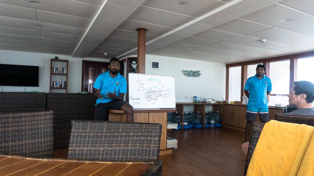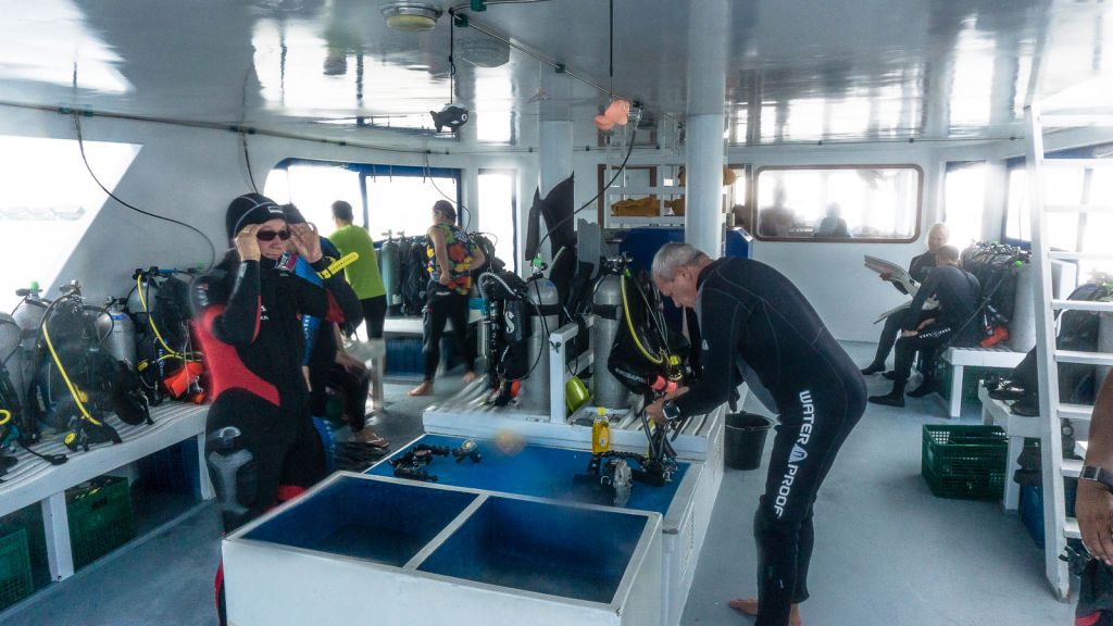 We had 3-4 dives a day. Before every dive, we met in one of the rooms on the main boat to discuss the dive site, before boarding the smaller dive dhoni. This dhoni would take us to the dive site where we would do our dives (60 minutes or 50 bar) before coming back to the main boat. The schedule was something like this