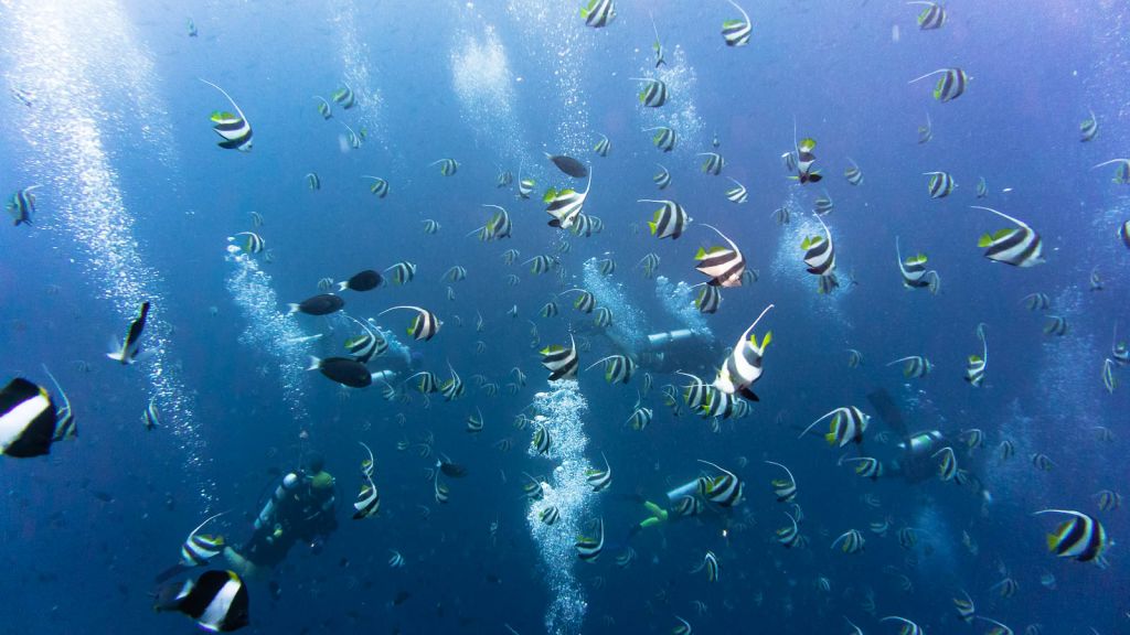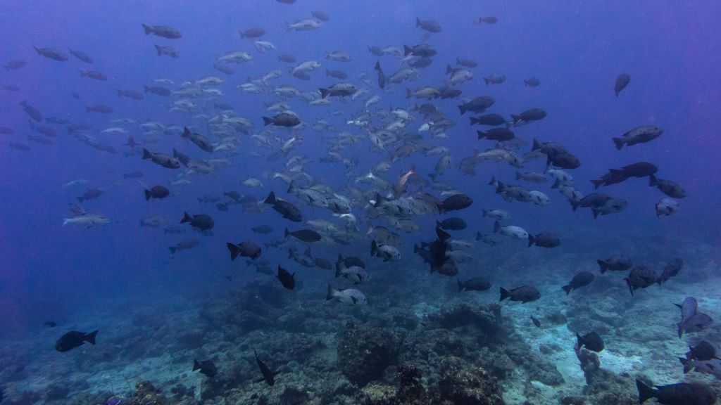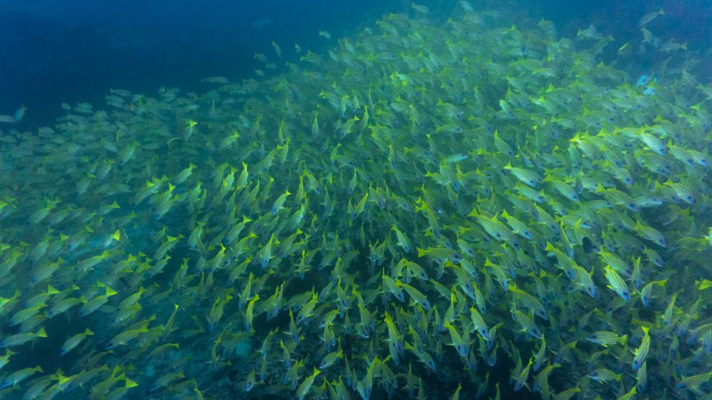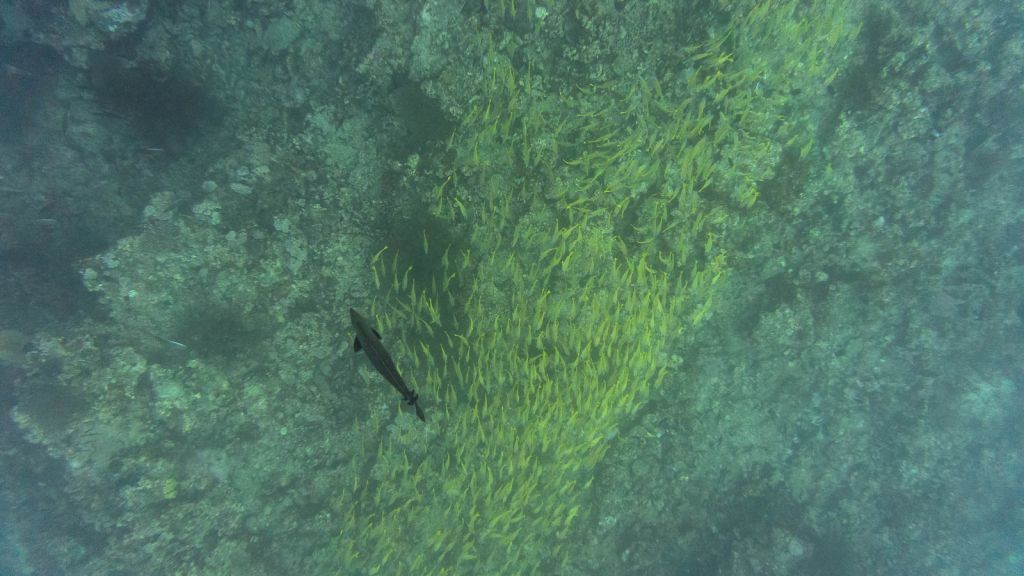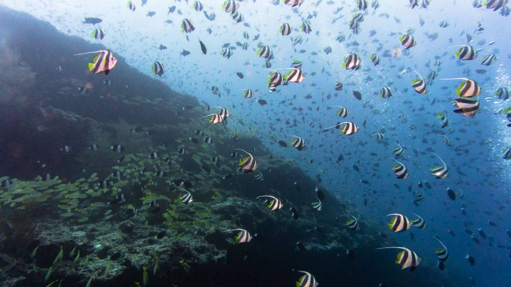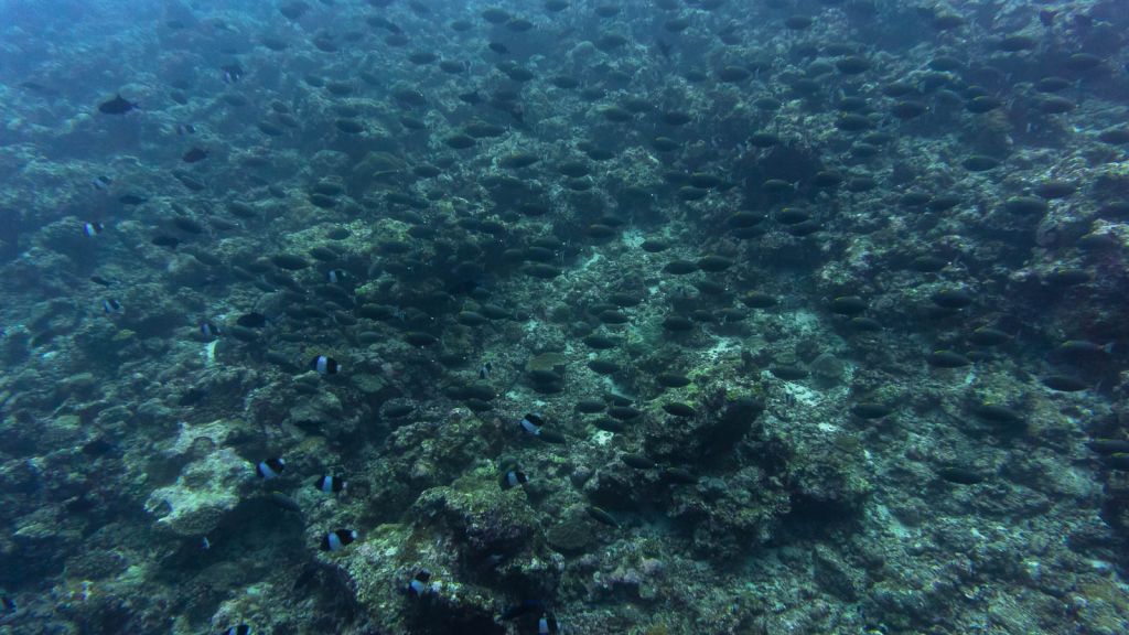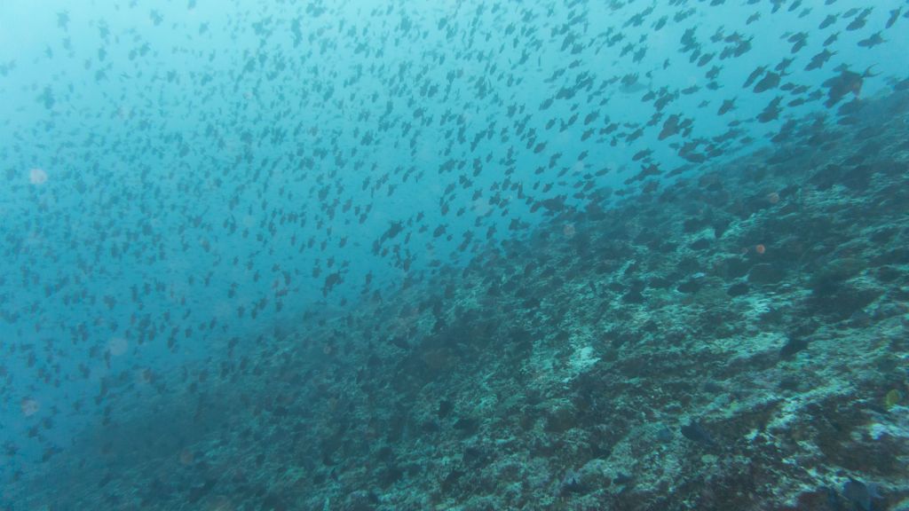 The concentration of fish is absolutely bananas. Schools of angelfish immediately greeted me upon descending in numbers I’ve never seen before. Swimming around the dive site, we encountered different clusters of fish in different areas, but all in massive quantities.