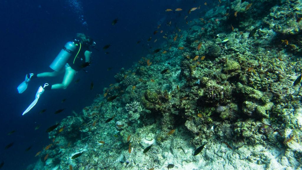 After the current check, which confirms it’s coming from the right, we jump in the Madivaru Corner dive site and descend slowly next to a wall which already makes me smile.