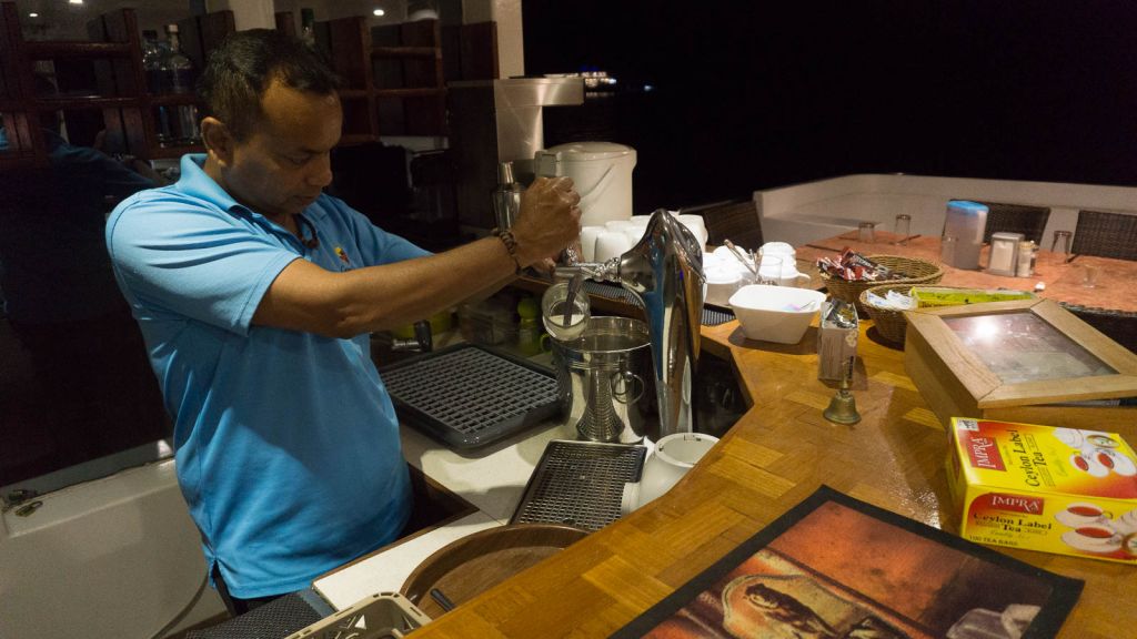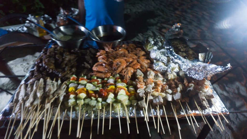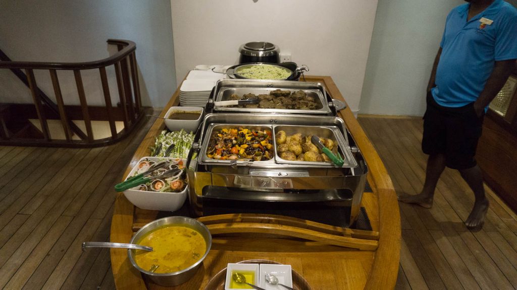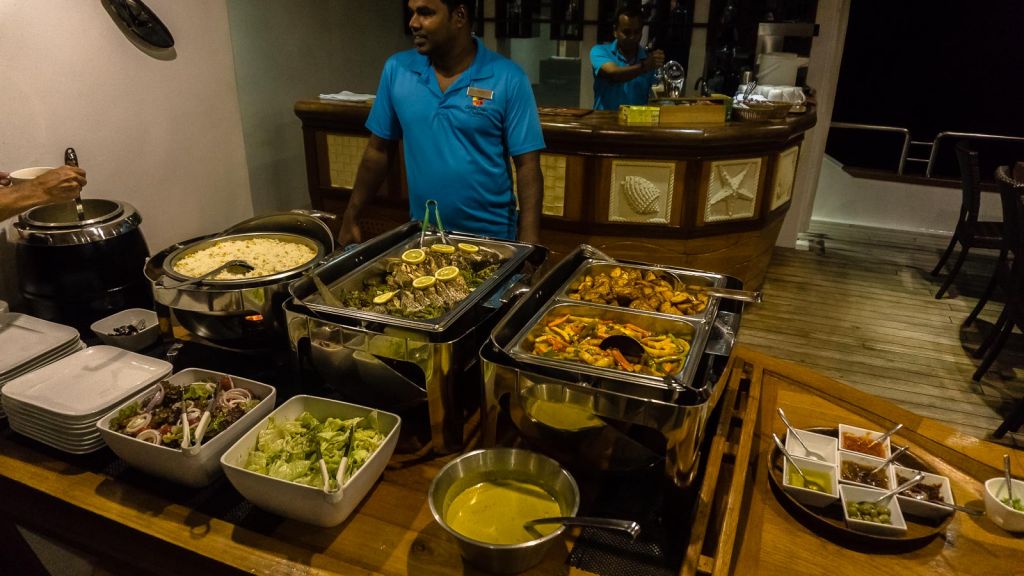 For lunch, there would always be a curry, with fish or chicken and more fruits. For dinner, we had some amazing food including steaks, lamb chops, fish curries, freshly grilled fish, and more. One night, we did a beach side BBQ where they stuffed us with seafood including fish, prawns, and calamari. All food was served buffet style and I could have asked for more food in between meals but I was always amply stuffed after my dives.