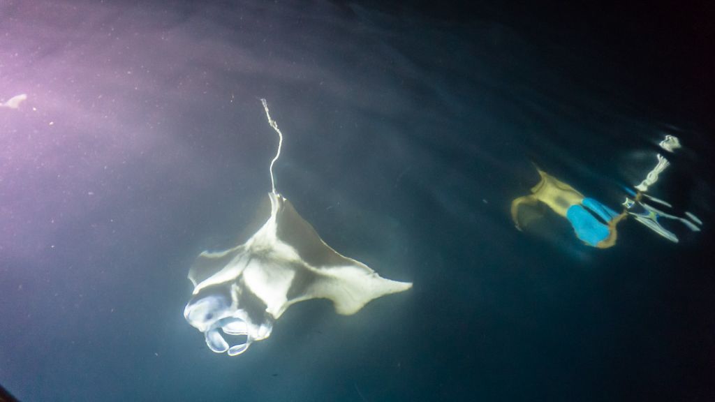 I pulled up a chair and waited anxiously. Within 20 minutes, I could see a large white and black shape take form in the water swimming towards our light. Few moments later, I could see the manta breach the surface doing its signature back flip as it chomped Manta found!
