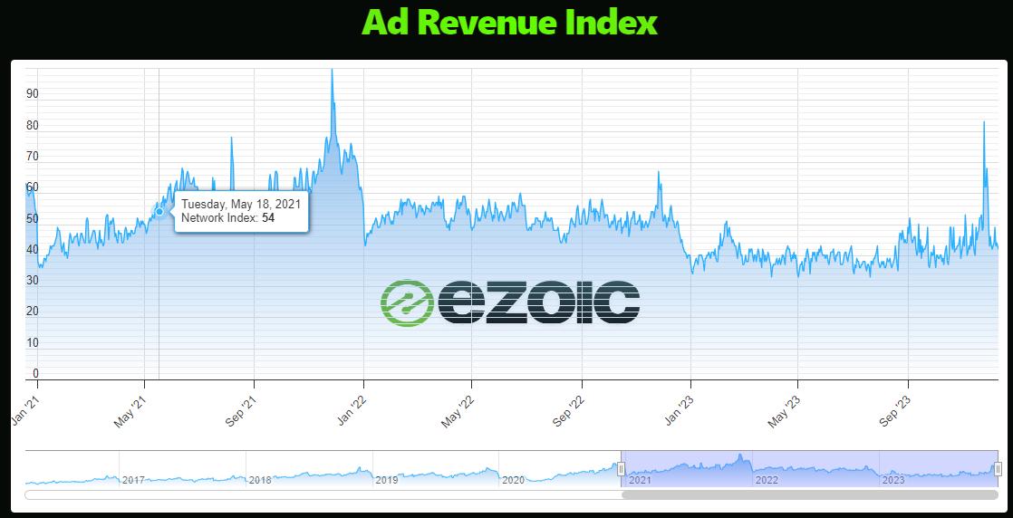 Finally, Ezoic has an “Ad Revenue Index” which gauges the strength of the advertising market. This is generally quite correlated with the strength of the economy and to a lesser degree corelated with the economy.