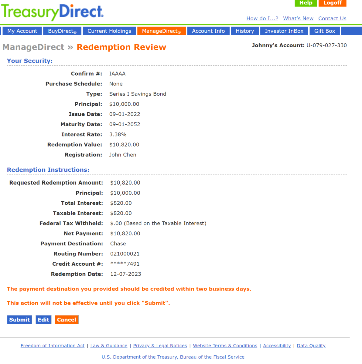 In addition, make sure to triple check your account and routing numbers. TreasuryDirect’s website does not do any sort of verification on your bank account so if you have the wrong number, it won’t work.