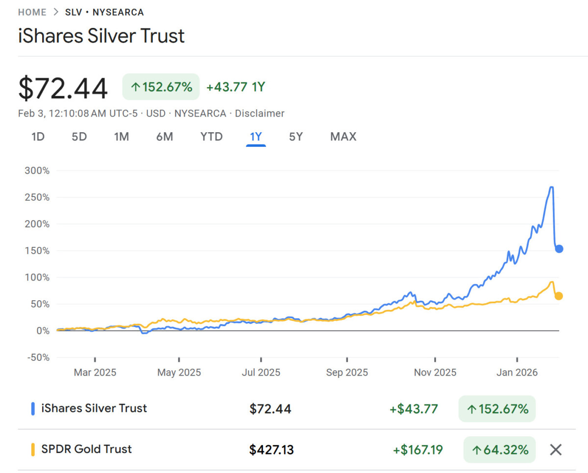 At the same time, markets didn’t move in a straight line. There were sharp swings — like the mid-January sell-off tied to trade policy headlines and tariff threats that rattled tech stocks. Like it’s always been under Trump, these things come and go so quickly if you blink, you miss the rally back. Commodities like gold and silver went parabolic and started mooning upwards unlike I’ve ever seen. Silver has gone up 270% in the last year and has become of the best performing assets out there at the expense of a weakened Dollar. As quickly as it went up, it crashed down 30% in a day in the worst one day sell off in decades.