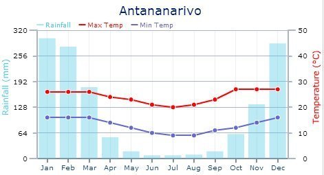 - The area surrounding Antananarivo, Madagascar’s capital, is surrounded by mountains giving a climate that is cool at night