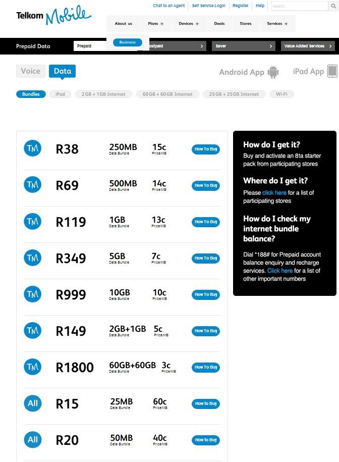 Prepaid plans are simple to set up on all of South Africa’s mobile networks. Simply load “airtime” as they call it, which is just money. Airtime can be purchased conveniently at grocery and convenience stores. After purchasing airtime, you can then purchase data packages in various increments. Data is not cheap, with 1gb going for R150-2000 depending on your carrier. For actual phone calls and texts, your airtime will be deducted according to whatever rates are charged (usually R1-2/minute). I actually quite enjoy using method because it allows me to control exactly what I want to spend money on. Turns out, I don’t spend money on much. Because data is unlimited, I’ve learned to control my data usage, specifically to save my data-intensive activities for when I have wifi.
