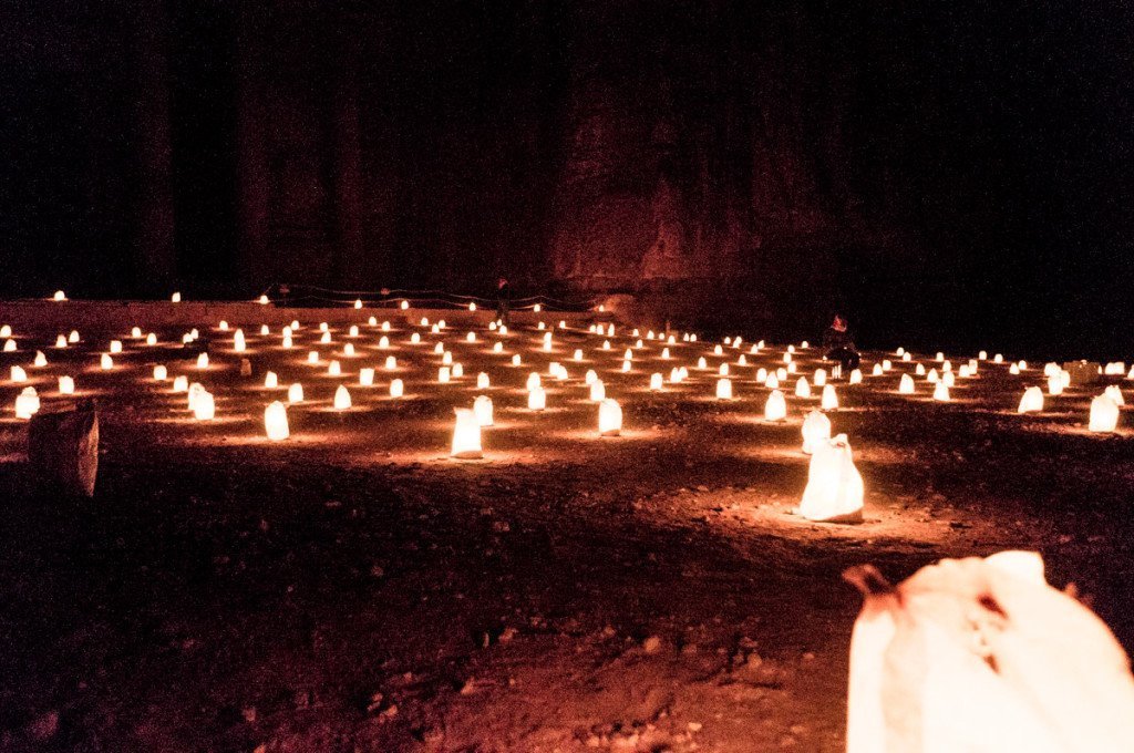 We walked back through the Siq, where I had been 12 hours earlier, and the entire Siq was lit up by candles. Beautiful. Eventually, we made it to the Treasury, where hundreds of people were gathered, sitting down behind hundreds of candles laid out in front of the Treasury.