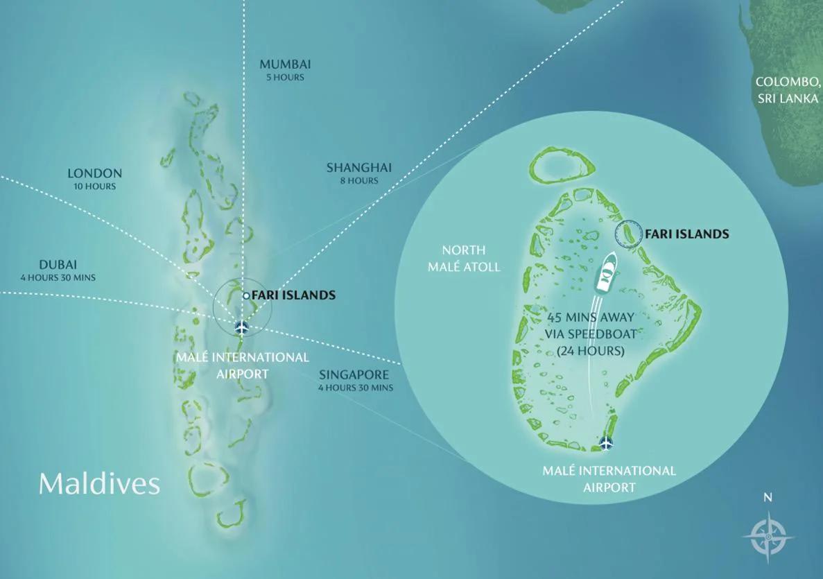 The Ritz Carlton is located in the Fari Island chain in the northeast part of the North Male Atoll roughly 40km away from Male International Airport.