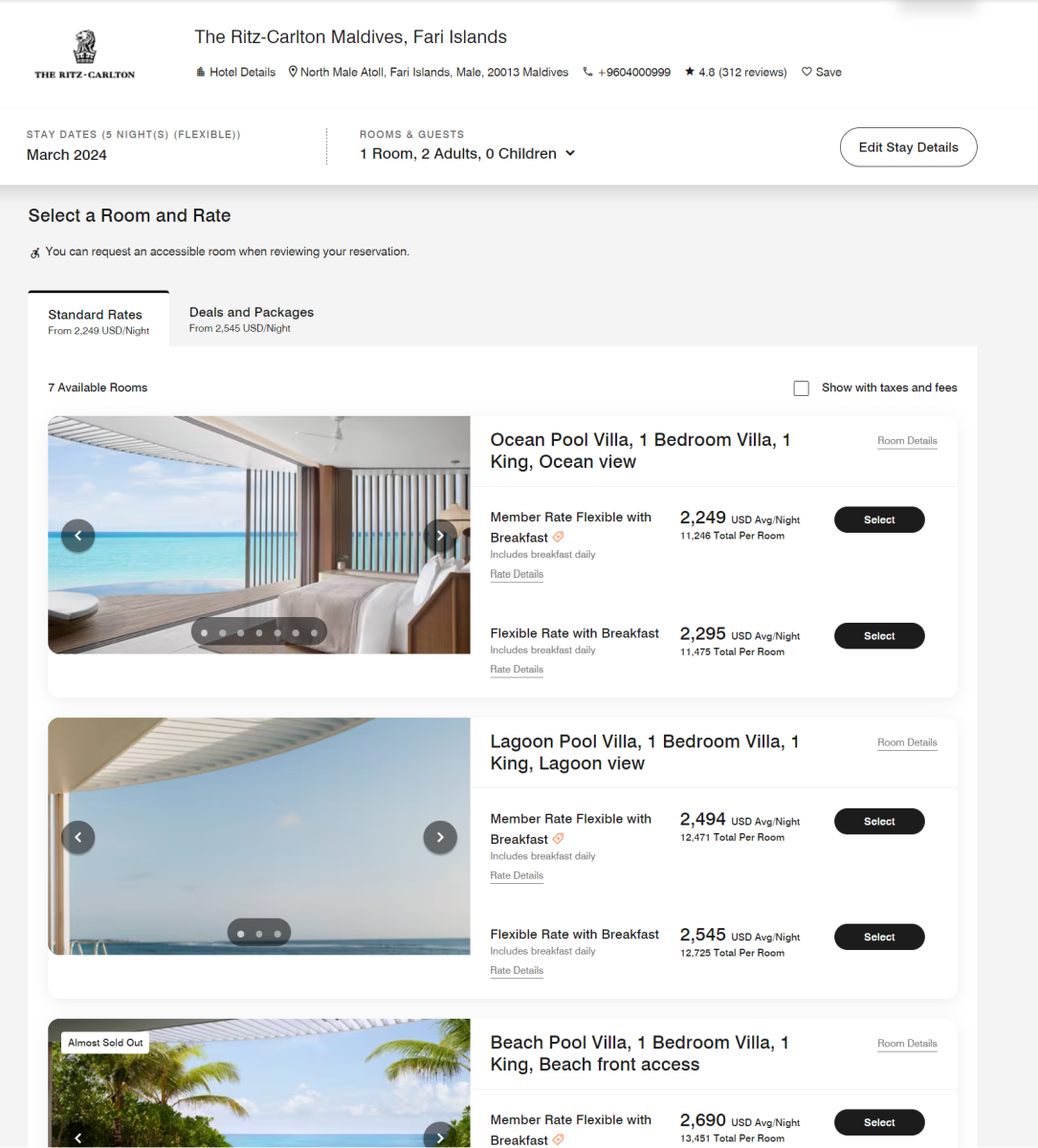 I booked my entire stay using Marriott Bonvoy Points. As Marriott no longer uses hotel categories, instead focusing on dynamic pricing models, the nightly rate for a stay at the Ritz Maldives ranges between 100,000 to 150,000 points for the ocean villa which are the lowest. Unlike the Hyatt which only allows you to book the “standard” beachfront room with points, Marriott allows you to book any room you’d like as long as you have the points.