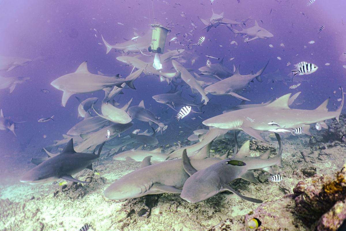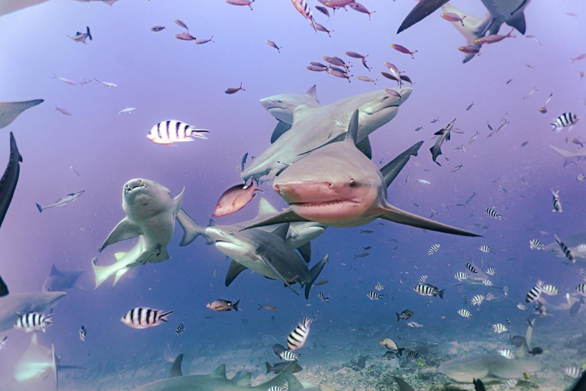 All shark diving operations in Fiji feed the sharks. Sometimes, this is a person literally hand feeding a piece of tuna into the sharks mouths. This is the only way to actually attract the insane amounts of sharks you see in all the videos and photos online. Sharks, and especially the famous bull sharks, are lone wolf type predators that you would never see with swarms of other fish. They would never come together in the fish tornadoes you see at the Beqa lagoon shark dives.