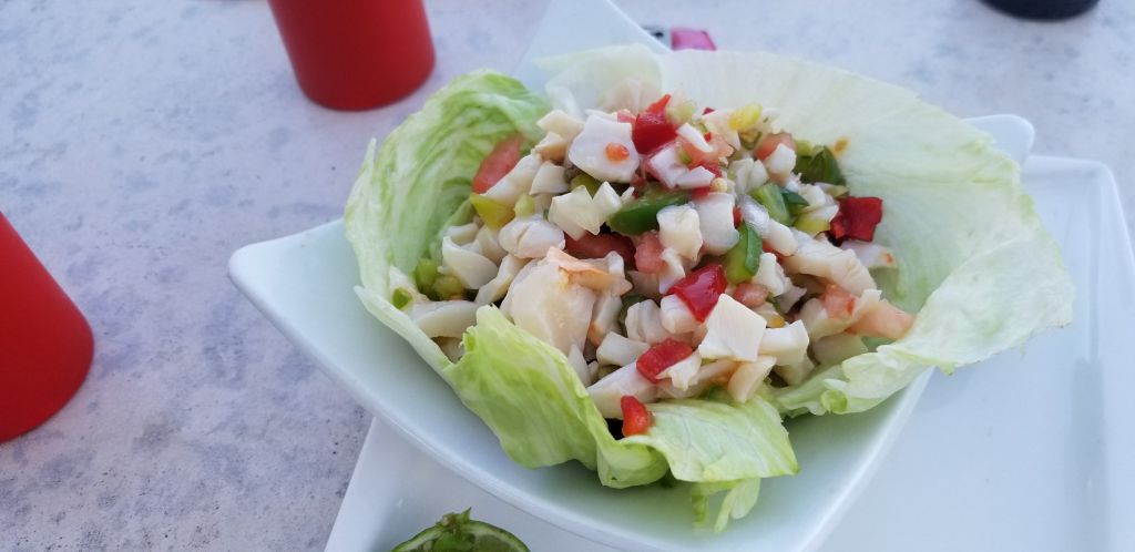 The tables outside are on the sand and during high tide, the water can even reach the tables allowing for some super cool pictures. They are famous for the conch salad here which is a must try when on Turks and Caicos. Get the traditional conch salad with scotch bonnett peppers here. It’s similar to Peruvian ceviche. Delicious!