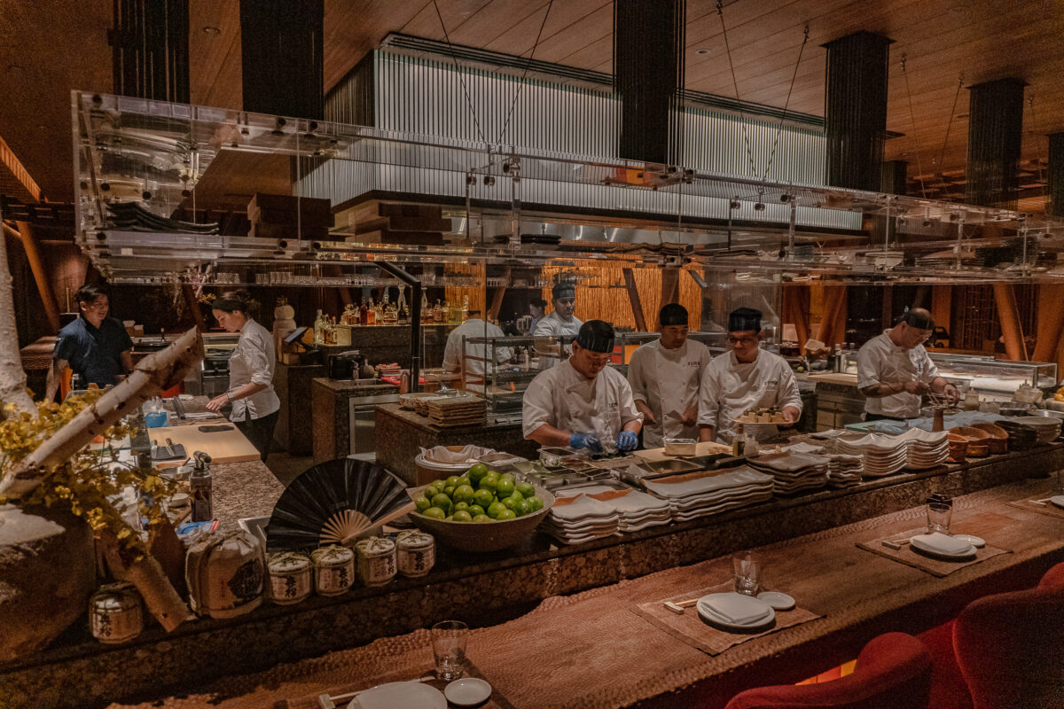 Zuma is unlike any other restaurant at the Waldorf (and the Maldives for that matter) as it really The entrance to Zuma is dramatic. You walk through a tunnel-like structure with optical illusion lighting and wood panels that creates this almost otherworldly transition from the resort to the restaurant. Then you emerge into this stunning space floating above the Indian Ocean. Huge woven bamboo and glass screens surround the restaurant, and the central island bar combines the robata grill and sushi counter in a way I haven’t seen at other Zuma locations.