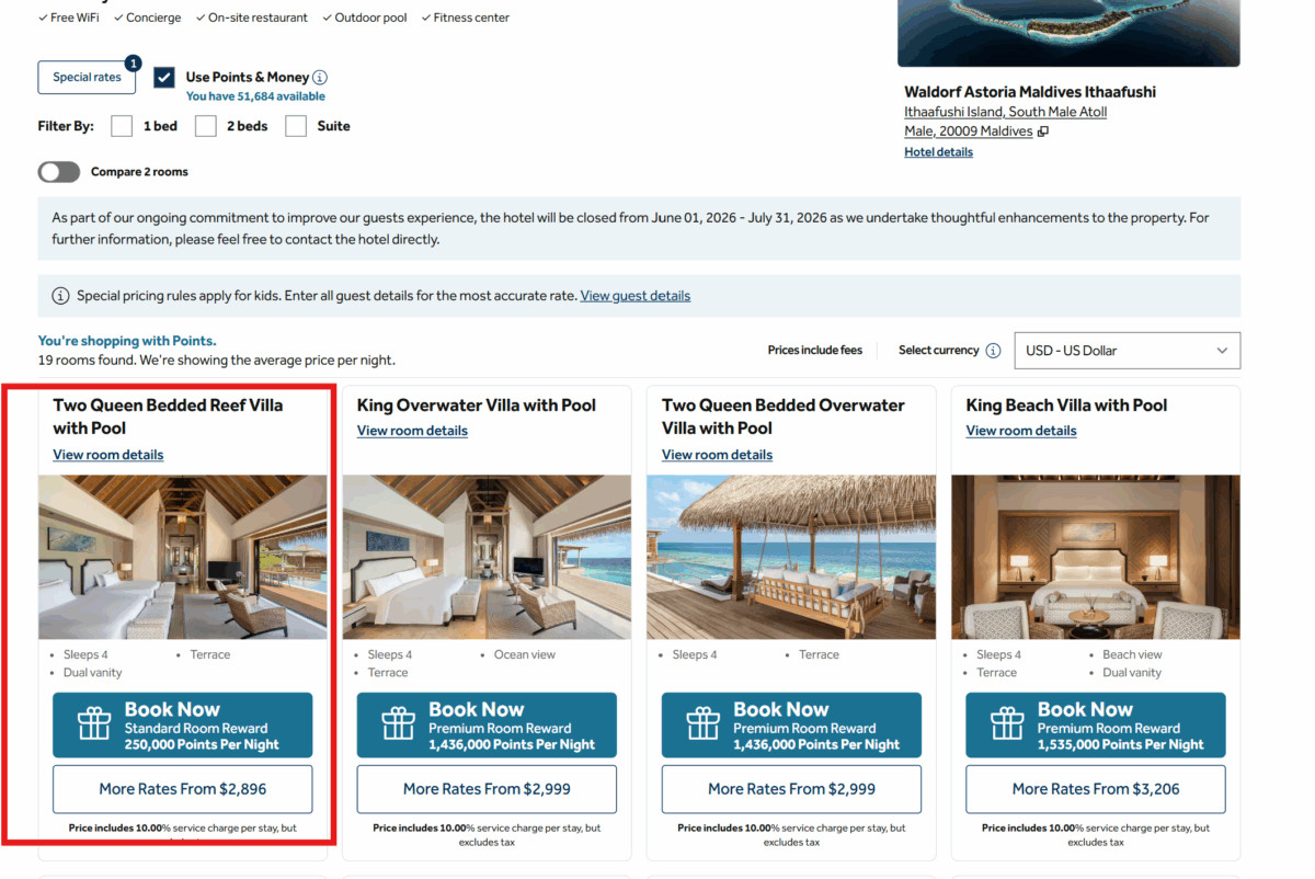 Without award availabilities, you can book a night for an insane amount of points in the 7 digits. It’s so insane I think it’s just Hilton’s way of telling their loyalty members that the Waldorf Itaafushi is off limits.